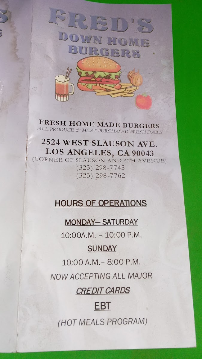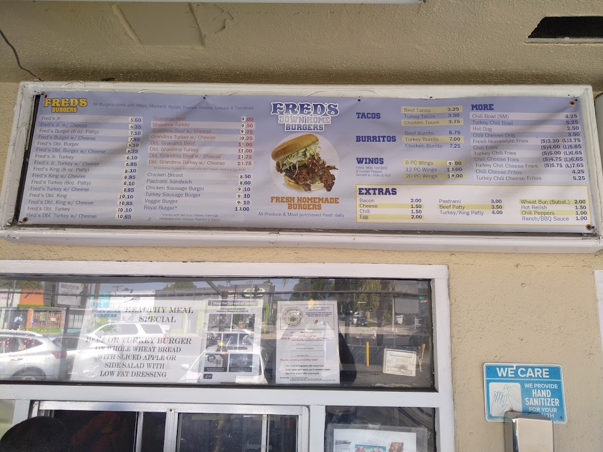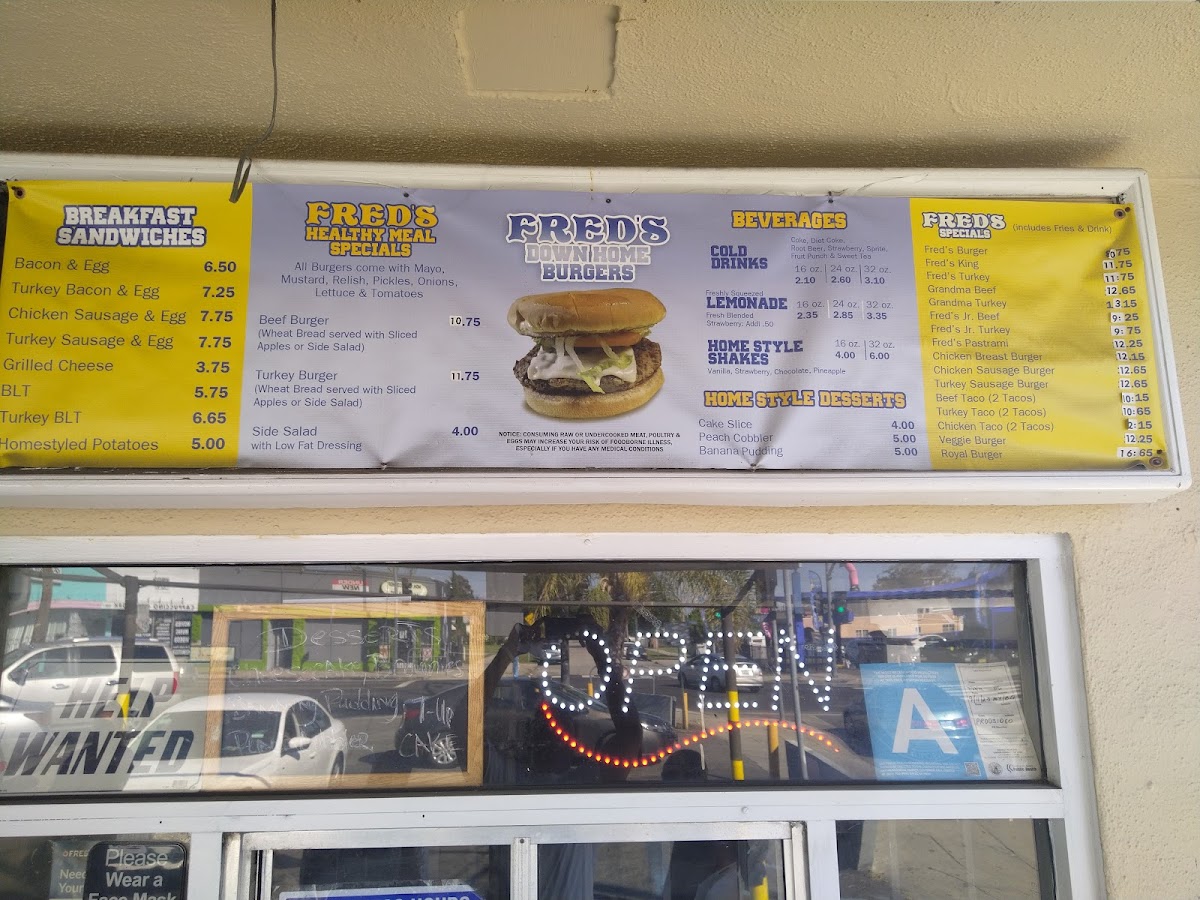 Fred's Downhome Burgers, where every bite takes you on a flavorful journey! Nestled at 2524 W Slauson Ave, Los Angeles, CA, our menu is a tribute to hearty, mouthwatering classics that will keep you coming back for more. Indulge in our signature Turkey Burger for a lean twist, or go all out with the Double Bacon Chili Cheese Burger—it's a crowd favorite! Craving something light? Try our Chicken Sandwich or the old-school Old Burger Told Me topped with fresh lettuce and tomatoes. For those who appreciate a classic combo, our Royal Burger and Fries with Cheese will hit the spot. Don’t forget to check out our tasty sides, like Fresh Homestyle Fries or the irresistible Chili Cheeseburger and Fries. Whether you're a burger aficionado or just in the mood for a quick bite, Fred's promises a memorable meal that’ll make your taste buds sing. Come hungry and experience the warmth of good food and good company at Fred’s!